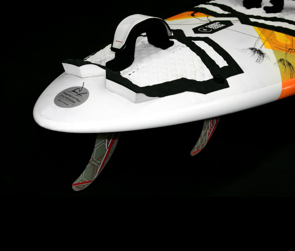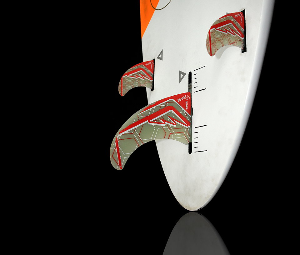 The foil thickness is only 9.6mm and positioned at 38% forward. We found this is the best balance for wave riding, early planing and upwind performance. The outline and angles naturally evolve on the bigger sizes for increased power and top end speed. The material chosen is G10. The fins are CNC designed and machined.