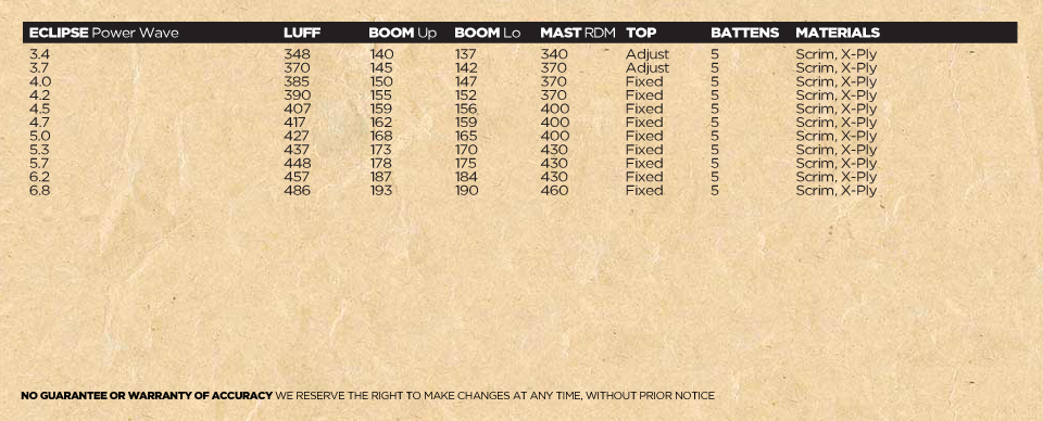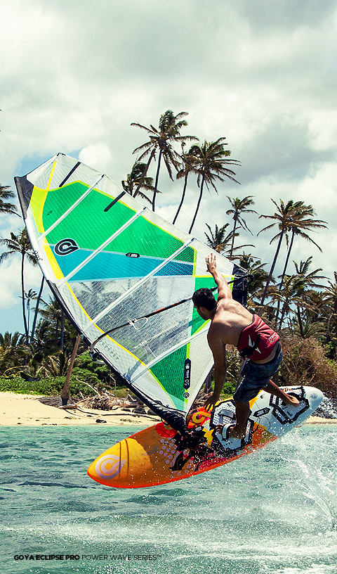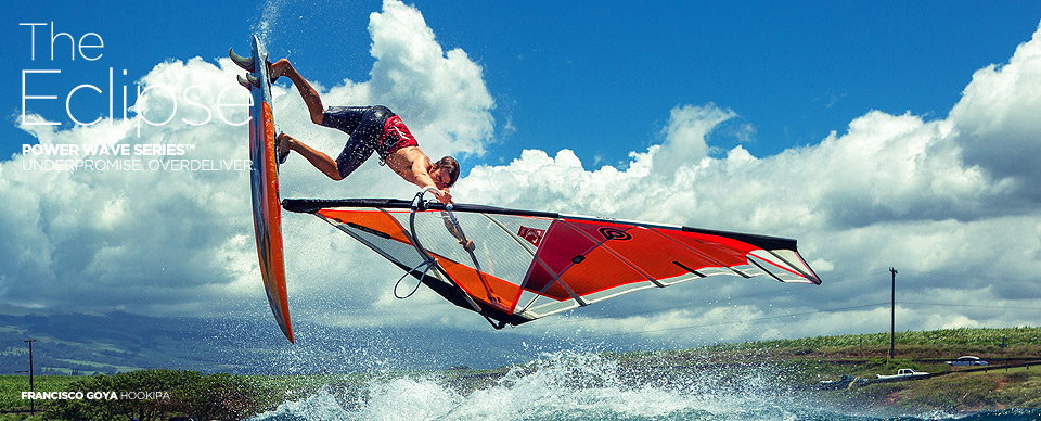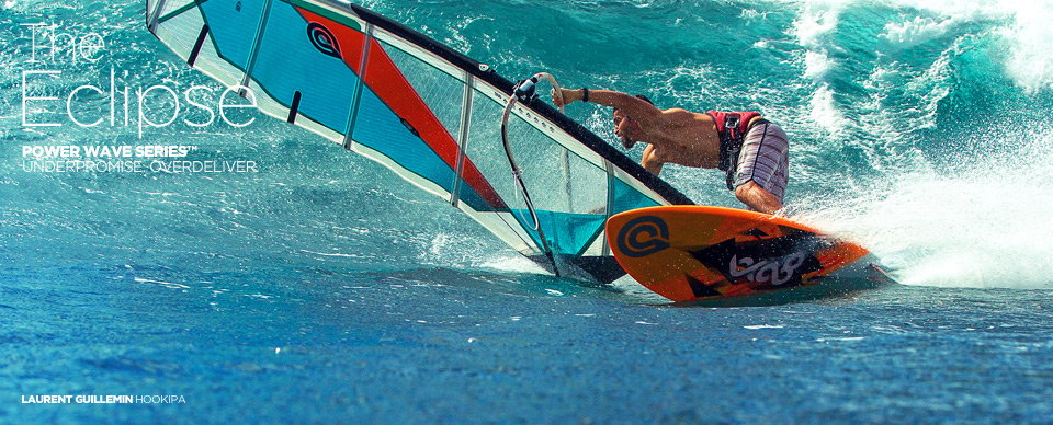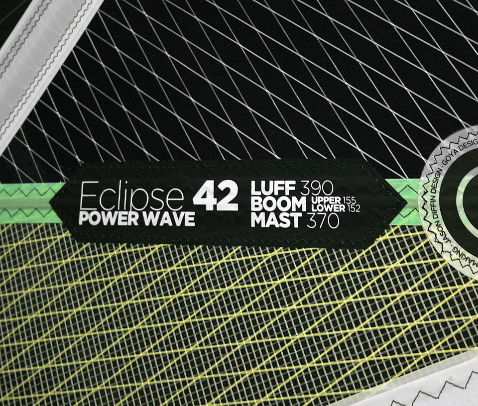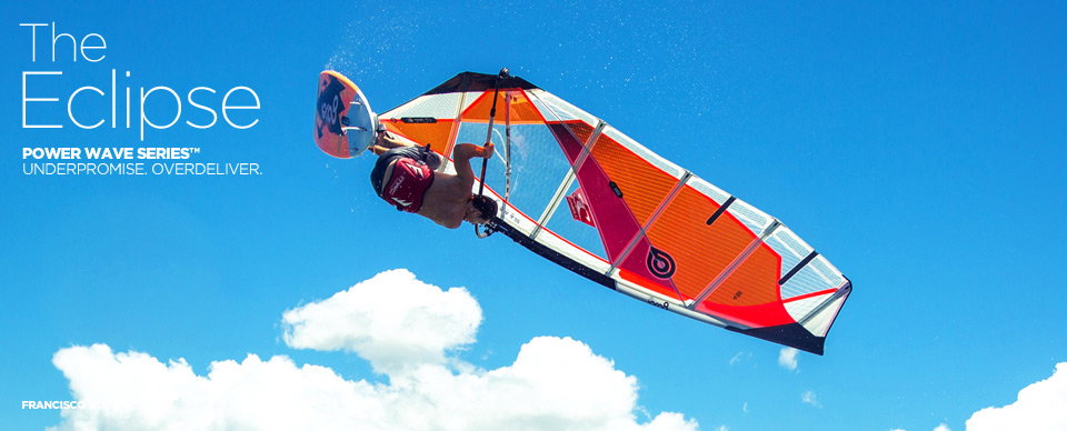 Jason’s words: “Lighter and easier high wind handling in sizes up to 5.0. Sizes 5.3 and larger put an emphasis on quick stable power alongside easy handling. The Eclipse has great low end power, a massive high wind range plus unlimited speed potential. 5 battens make the Eclipse a very stable sail with easy handling when very powered up. All wave and wave style sailing conditions suit the Eclipse just as well as freewave and freestyle sailing. The Eclipse gives stability and range, along with a highy durable construction. Well suited to single fin and multi fin boards.”