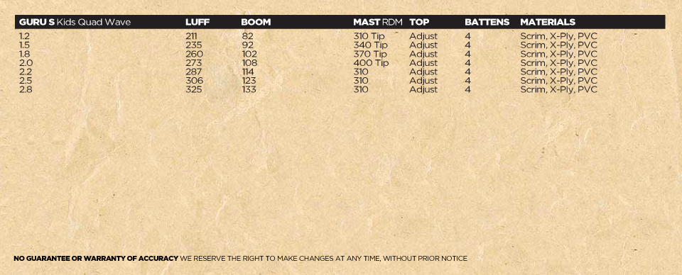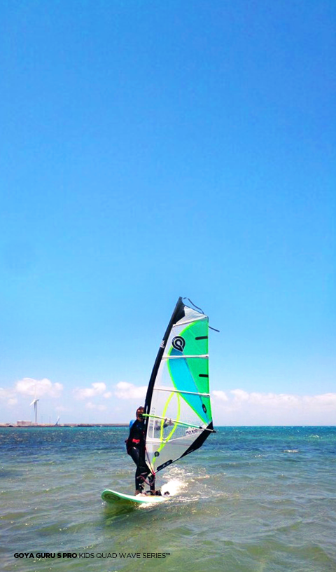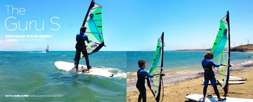 Jason’s words: “Super light weight, very durable, very easy handling, a dedicated performance wave sail for kids. Target riders are kids and smaller riders under 45 kilos. The Guru S can be used in flat water for beginner training, when fully planing and of course in any wave condition, as the Guru S is modeled after the Guru G4 concept of extreme durability and easy, soft handling in a wide variety of wind and wave conditions. Learn, plane, jump, surf, loop, anything is possible with the Guru S. This is, after all, a performance wave sail.”