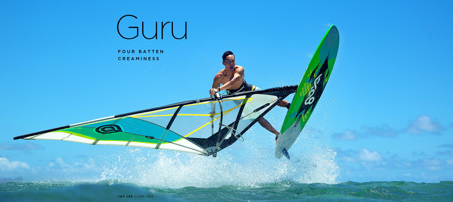 Jason Diffin: “Sailors looking for ultimate comfort and control will feel right at home with the Guru. For this season the Guru has been updated with new materials in key flex zones resulting in an even smoother feeling sail overall. The Guru handles gusts extremely well with its vinyl window. The rigging range of the Guru is huge, you can rig it for power with a light outhaul setting or you can rig it to feel more neutral with more outhaul.